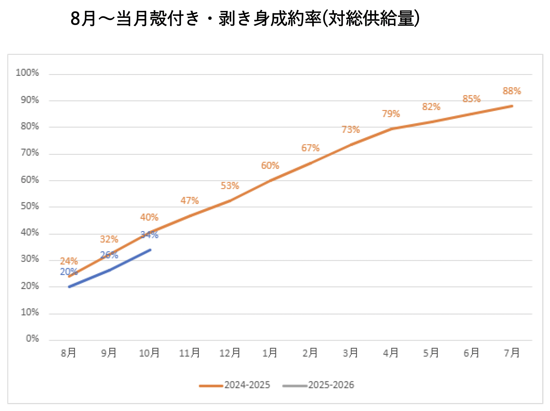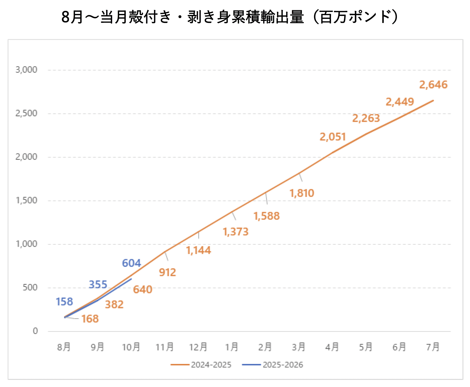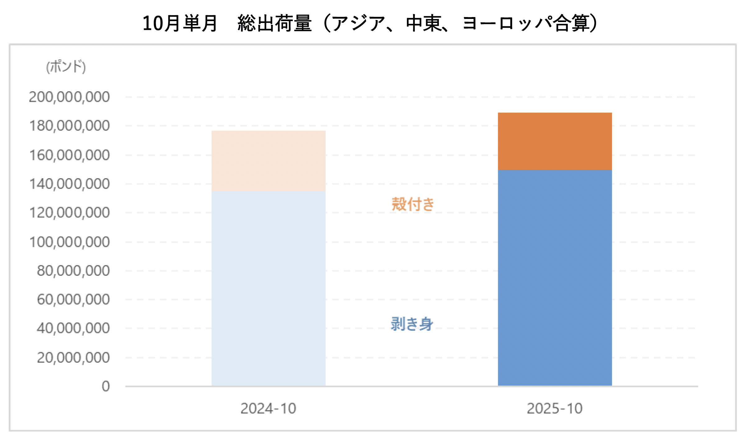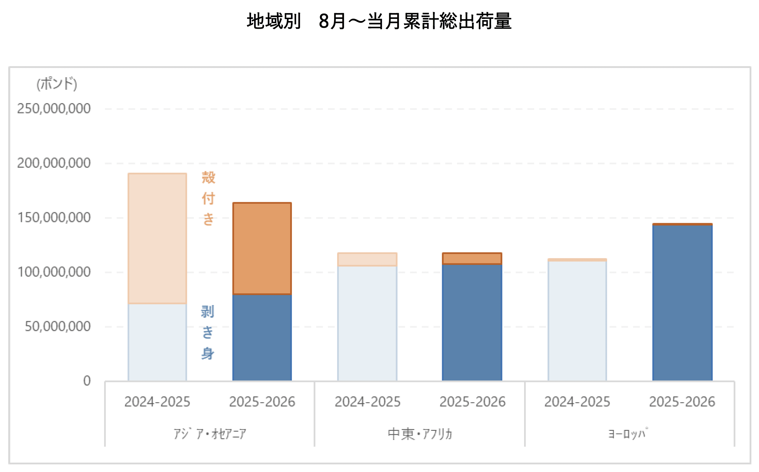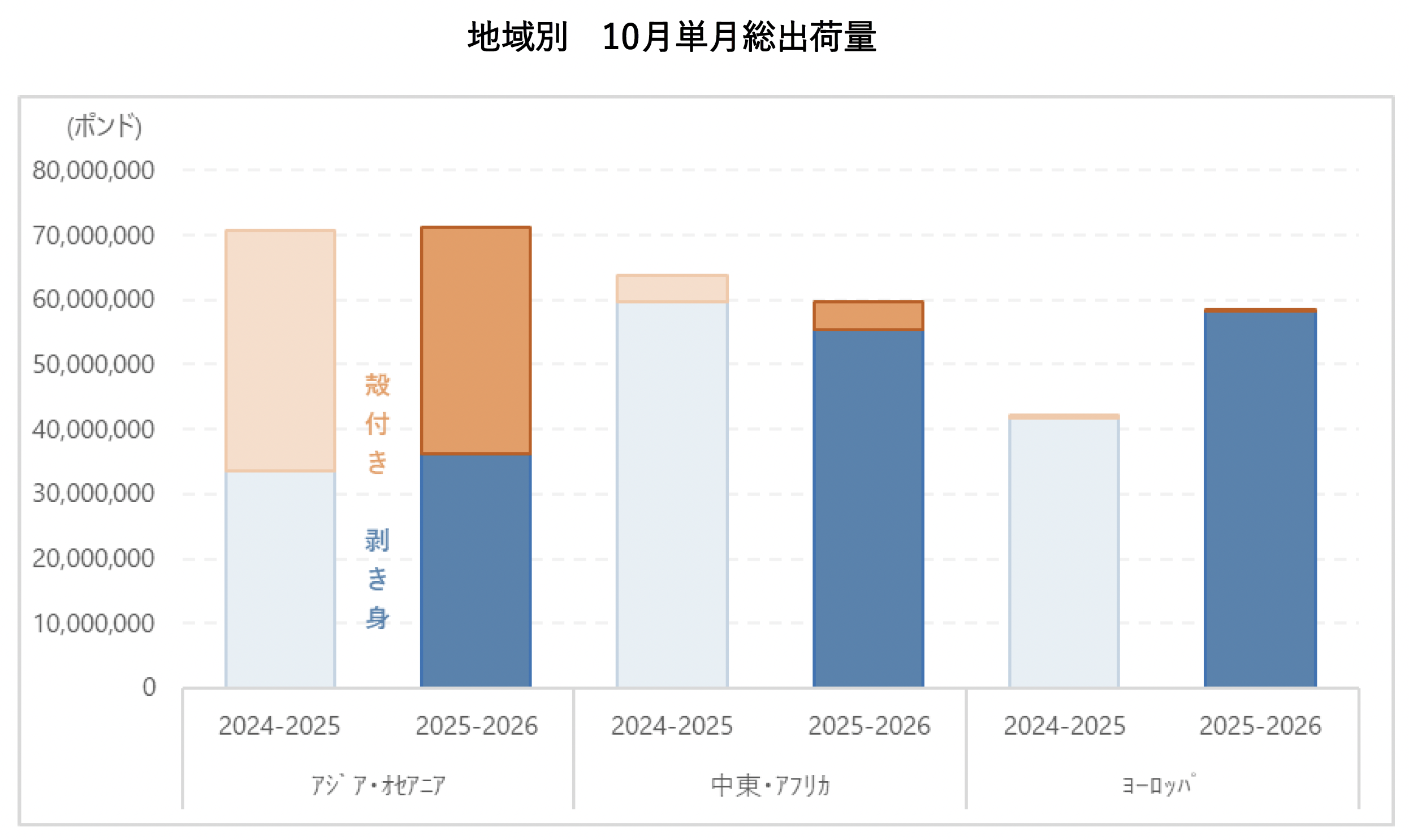 アジア・オセアニア全体では剥き身8%増加、殻付き6%減少となります。