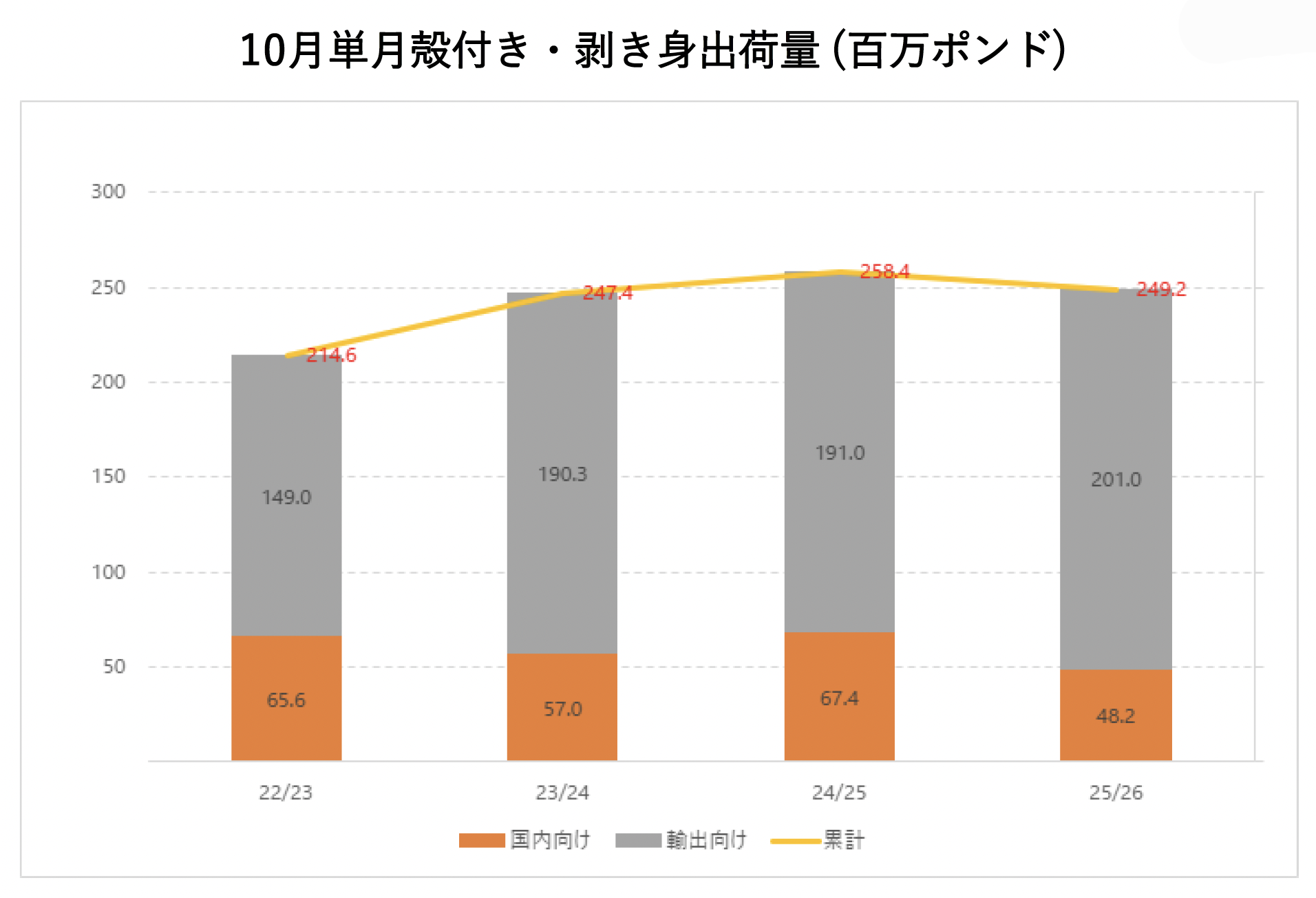 2025年10月単月の出荷量は 249,228,858 ポンドとなり、前年の10月単月出荷量を4% 下回りました。