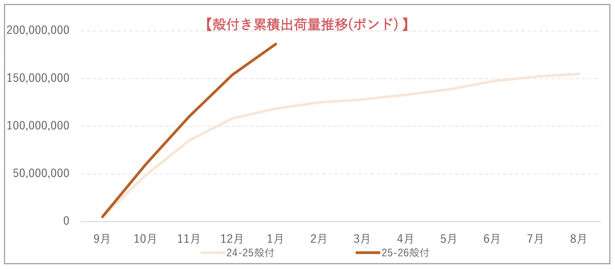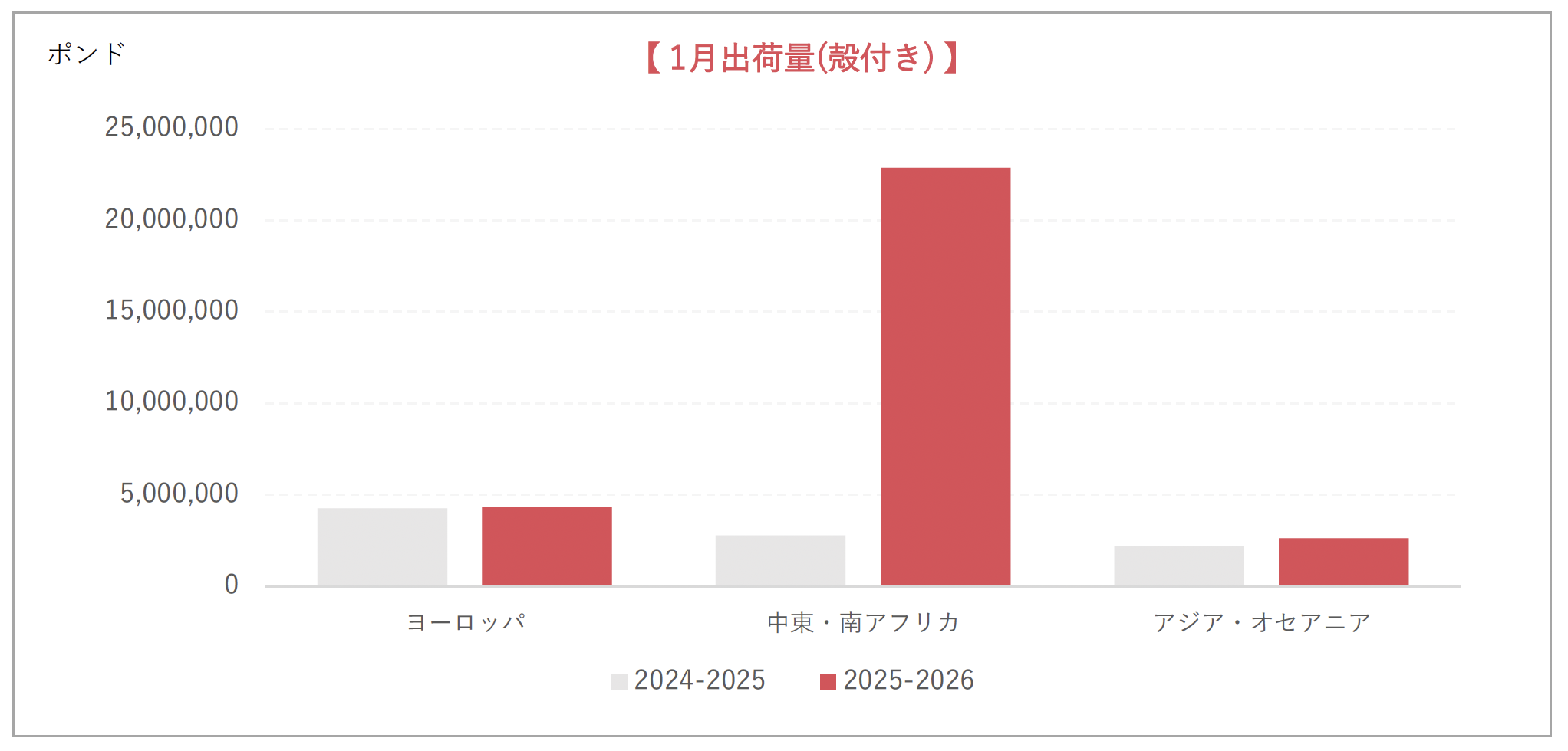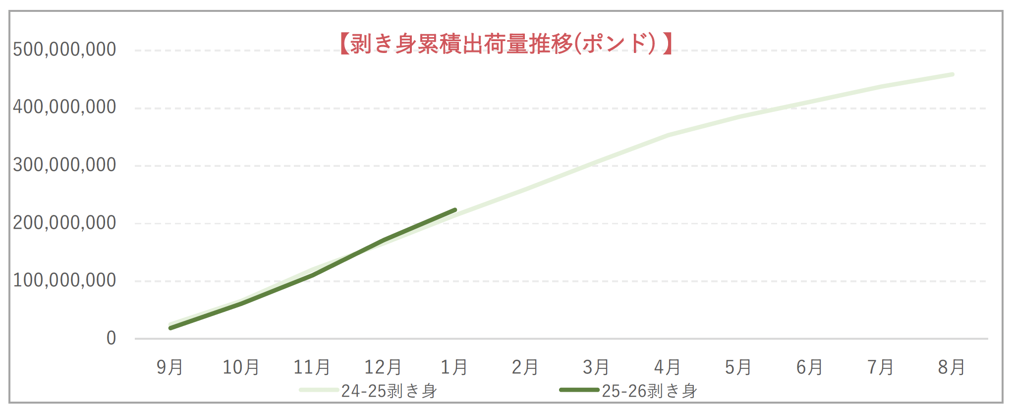 日本向けの剥き身に関しての2026年1月末迄の総出荷量は、224,047,140 ポンド(前年比4%増)となっております。