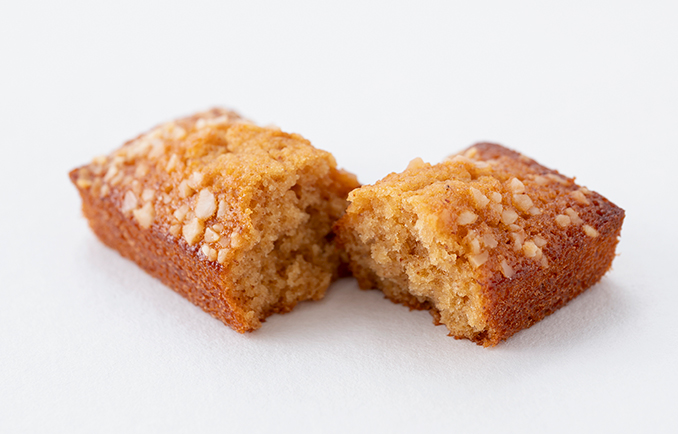 今回のフィナンシェにはアーモンドパウダーだけではなく、アーモンドプラリネを使用することによって、よりアーモンドの色味、香り、味が引き立つようにと考えました。使用するお砂糖も、半量を和三盆糖にすることにより優しい甘みとコクをだし、口の中でアーモンド感がより広がるように仕上げました。